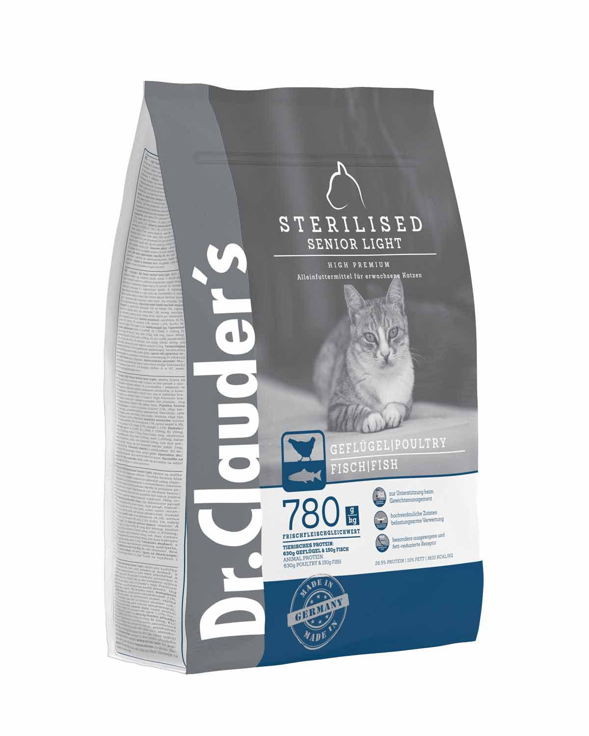 Dr.Clauder's High Premium Cat Sterilised Senior/Light er et højkvalitets fuldfoder med fjerkræopskrift, særligt udviklet til katte fra 8 år og til steriliserede katte. Foderet indeholder taurin og har et tilpasset energiniveau, der dækker de særlige behov hos både senior- og light-katte.