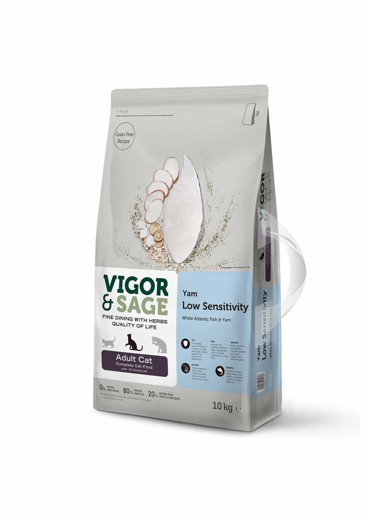 Vs Low Sensitivity Yam kattefoder til voksne katte, 10 kg er et komplet fuldfoder udviklet til voksne katte med fokus på letfordøjelighed og milde ingredienser. Opskriften indeholder yam som en af hovedingredienserne, hvilket giver en naturlig kilde til kulhydrater og fibre og gør foderet velegnet til katte med følsom mave.