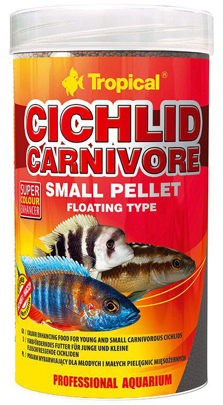 Tropical Cichlid Carnivore Small Pellet fiskefoder 1000 ml/360 g er et pelleteret foder særligt udviklet til kødædende tropiske cichlider. De små pellets gør det nemmere for arter med mindre mundstørrelser at tage foderet, og sammensætningen er målrettet fisk med et primært animalsk kostbehov, som for eksempel mange afrikanske og centralamerikanske cichlider.