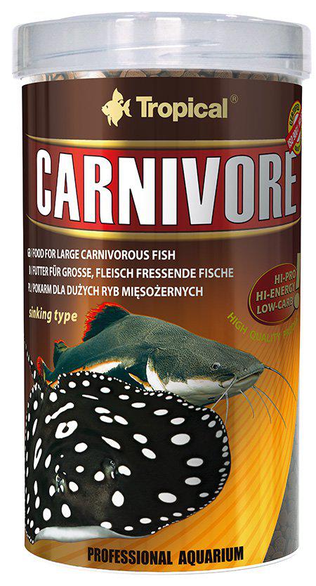 Tropical Carnivore 1000 ml/600 g er et specialfoder udviklet til kødædende akvariefisk. Produktet leveres i en praktisk 1000 ml/600 g emballage og er sammensat til at dække rovfisks ernæringsbehov med fokus på højt proteinindhold og god accept. Navnet Tropical bevarer producentens kendte profil inden for akvariefoder.