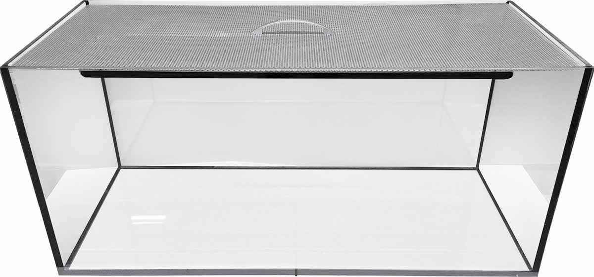 Akvariet er fremstillet i robust glas og leveres med et stabilt ventilationsnet i låget samt et praktisk håndtag, der sikrer god luftcirkulation og gør det let at åbne ved fodring eller indretning. Med en kapacitet på 96 l og de mål, der fremgår i produktnavnet, er der plads til dyb barkflis, tunneller og legetøj, så habitatet kan gøres både trygt og stimulerende.