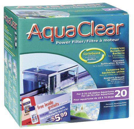 AQUACLEAR Hang-on powerfilter 20 125/378L/H <76L er et hang-on-back akvariefilter designet til akvarier op til 76 L. Filteret leverer en stabil vandgennemstrømning på 125/378 L/H og er velegnet til både ferskvands- og saltvandsakvarier, hvor pladsbesparende udvendig montering er en fordel.