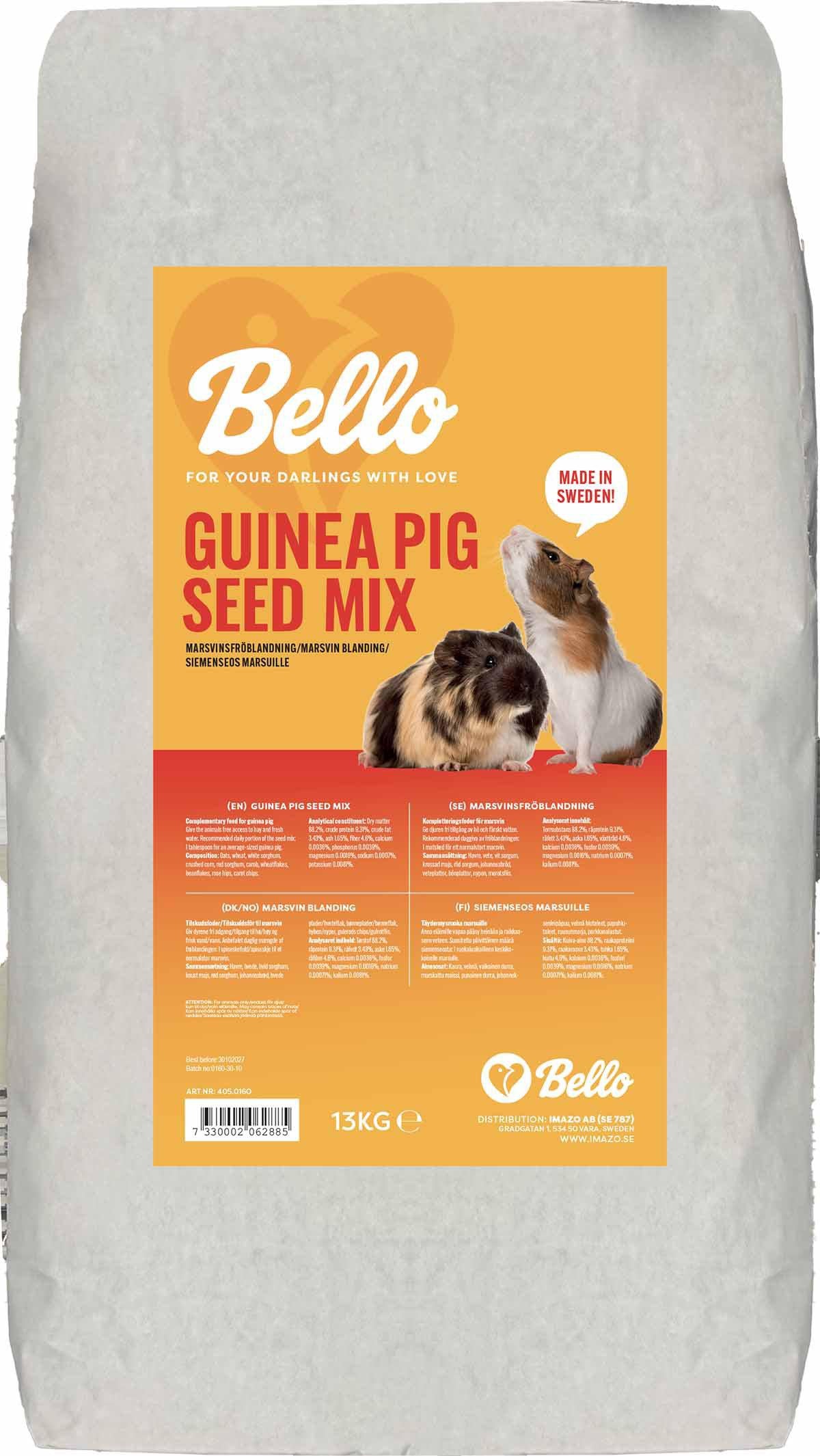BELLO Marsvin frøblanding 13 kg er en velsmagende og aktiverende frøblanding, udviklet som kompletteringsfoder til marsvin. Blandingen indeholder ingen pellets og er velegnet til at stimulere appetit og naturlig adfærd gennem lugt, smag og synlige ingredienser.