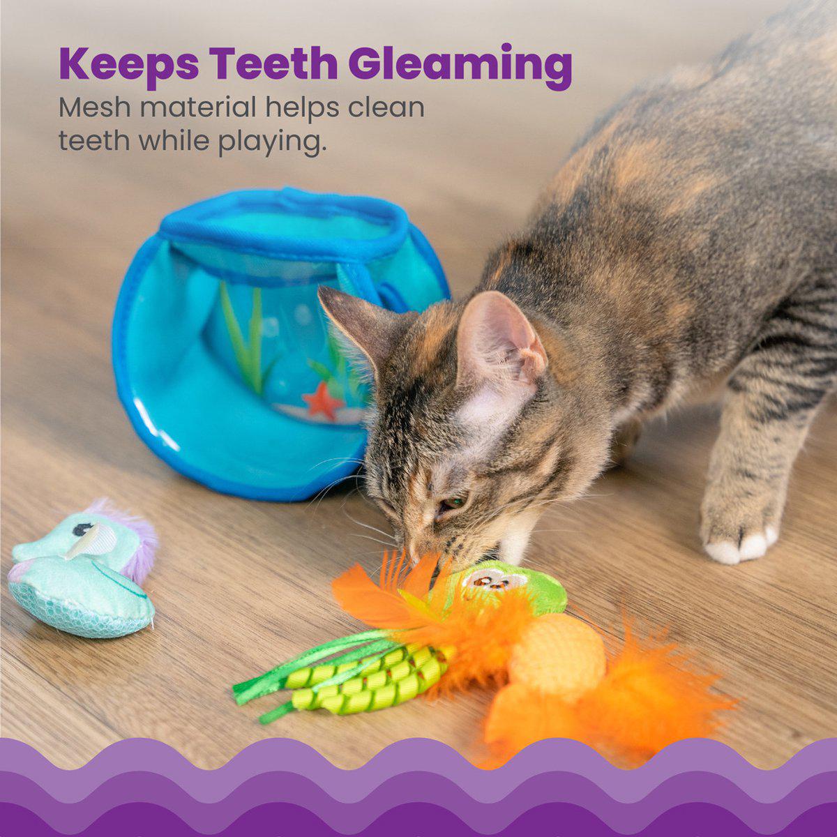 De to små figurer, en søhest og en fisk, er dækket af et netmateriale, som hjælper med at skrabe blød tandsten væk, når katten tygger. Indmaden består af katteurt (catnip) og polyesterfyld, hvilket giver både duft og fylde, der tiltrækker nysgerrige katte uden at gå på kompromis med holdbarheden.