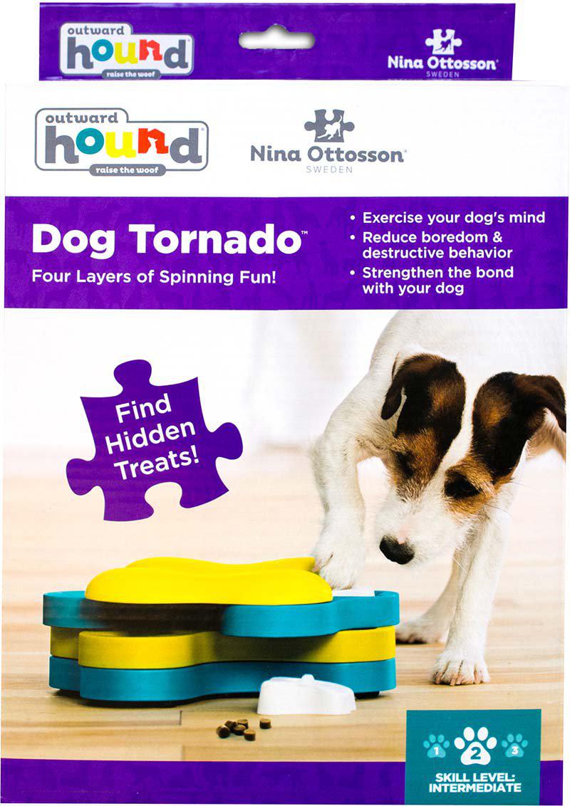 Hver etage i Dog Tornado snurrer, mens hunden søger efter godbidden, og den roterende bevægelse skaber en engagerende udfordring. Spillet er klassificeret som udfordringsniveau 2, hvilket betyder, at løsningen ofte kræver flere trin. Dæk nogle af facken med de benformede klodser for at gøre opgaven sværere, eller lad nogle godbidder være synlige i starten, så hunden hurtigt forstår konceptet.
