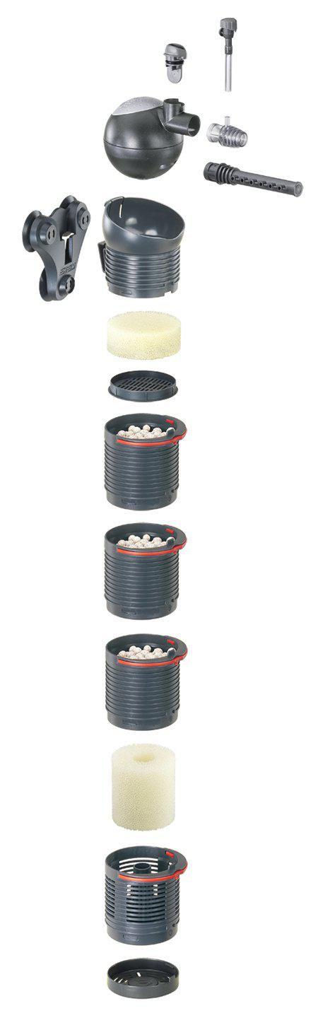 Indløbskurven med filterpatron til mekanisk-biologisk filtrering er placeret nederst, så vandet suges ind nedefra og pumpes op gennem de forskellige filterlag, før det ledes tilbage i akvariet. Den modulære konstruktion gør det muligt at rengøre filterpatroner eller filtermedia med forskudte intervaller, hvilket bevarer gavnlige bakteriekulturer og sikrer stabil biologisk filtrering over tid.