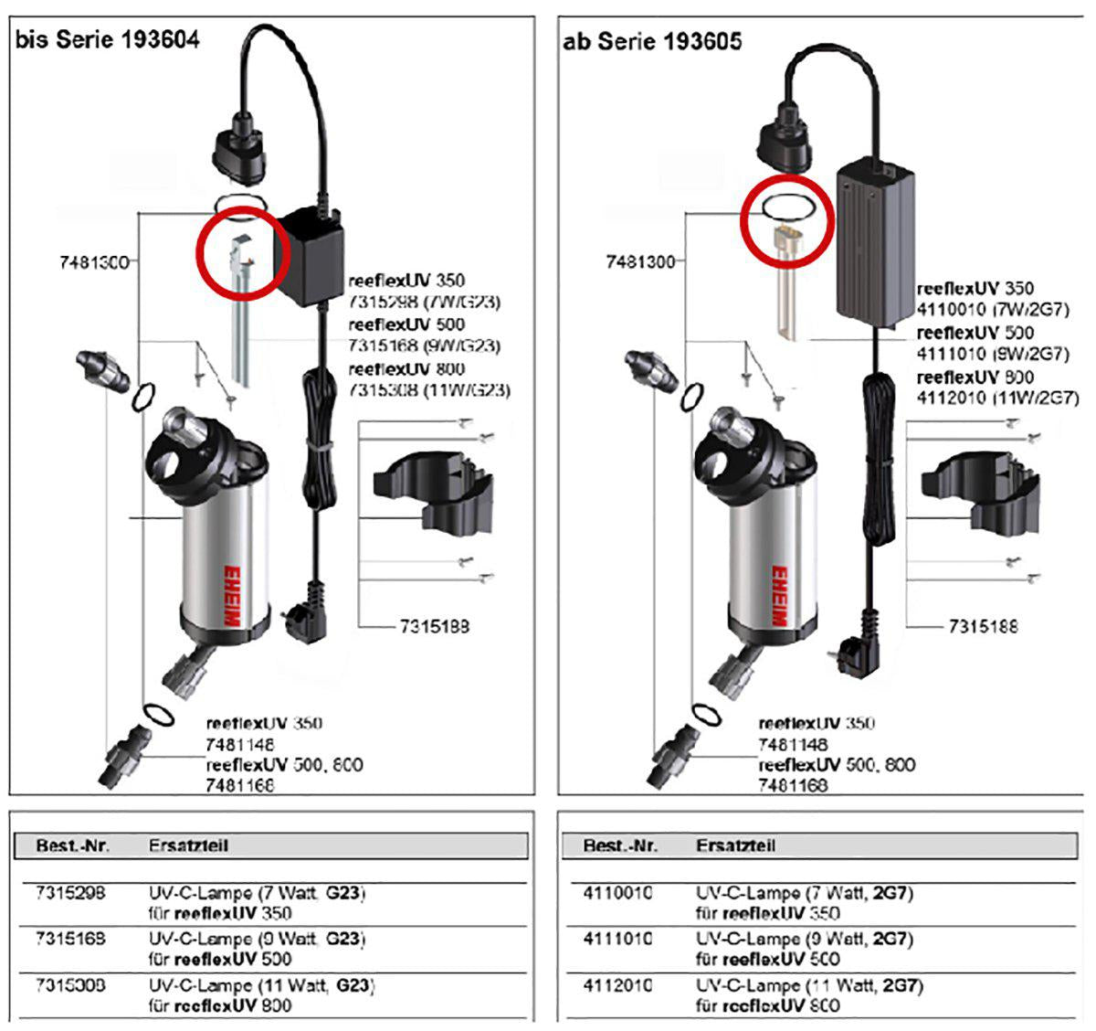 Ved udskiftning anbefales det at slukke og afbryde strømmen til enheden, før du håndterer pæren. Bestil Eheim Reeflex UV 500 9W for en præcis reserveløsning til din UV-sterilisator, og kontakt os gerne, hvis du er i tvivl om stiktypen eller kompatibiliteten.