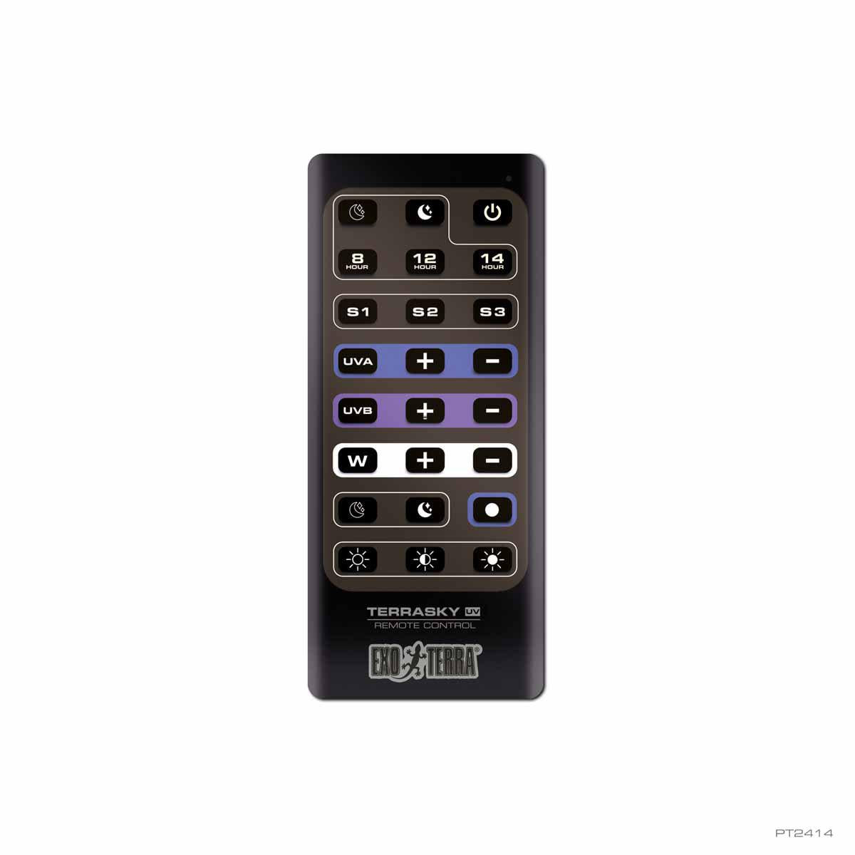 TerraSky leveres med en fjernbetjening, hvor du kan justere 6500K-hvidt lys, UVA og UVB i trin på 10% og gemme indstillinger på tre memory-knapper. Praktiske forudindstillede timere (8, 12 og 14 timer) inkluderer solopgangs- og solnedgangsfunktioner, så du nemt kan efterligne sæsoncyklusser med ét tryk. Der er også tre forhåndsindstillede dagslysprofiler, to måneindstillinger samt en dedikeret biofluorescensfunktion, der fremhæver biofluorescerende egenskaber hos planter, invertebrater, reptiler og amfibier om natten.