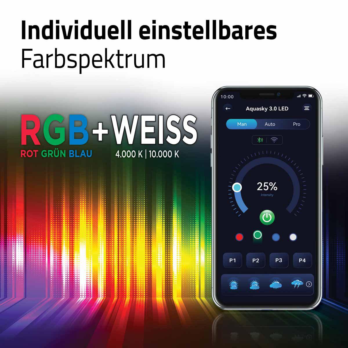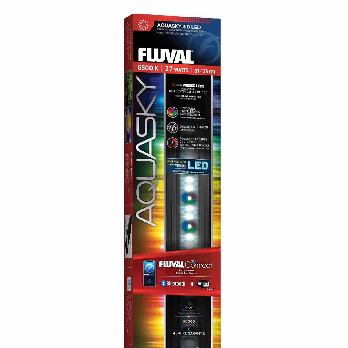Fluval Aquasky 3.0 giver fleksibel og kraftfuld LED-belysning til plantede og fiskedrevne akvarier. Med RGB samt dobbelte hvide dioder kan lyset fintunes for at fremhæve farver og fremme vækst hos både planter og fisk. Den programmerbare 24-timers lyscyklus gør det enkelt at simulere solopgang, højlys, skumring og nattebelysning for en naturtro visningsoplevelse.