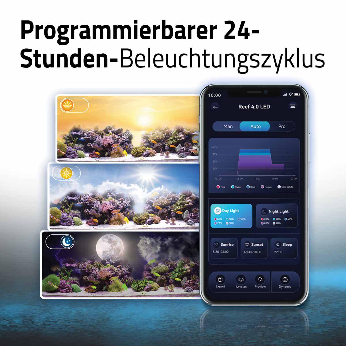 Alle indstillinger styres via FluvalConnect-appen, hvor du kan regulere uafhængige farvekanaler, programmere en fuld 24-timers lyscyklus med solopgang, middag, skumring og nat samt aktivere specialeffekter. Vælg mellem flere forindstillinger eller opret dine egne scener for at efterligne naturlige sol- og månecyklusser og optimere forholdene for forskellige korallers behov.