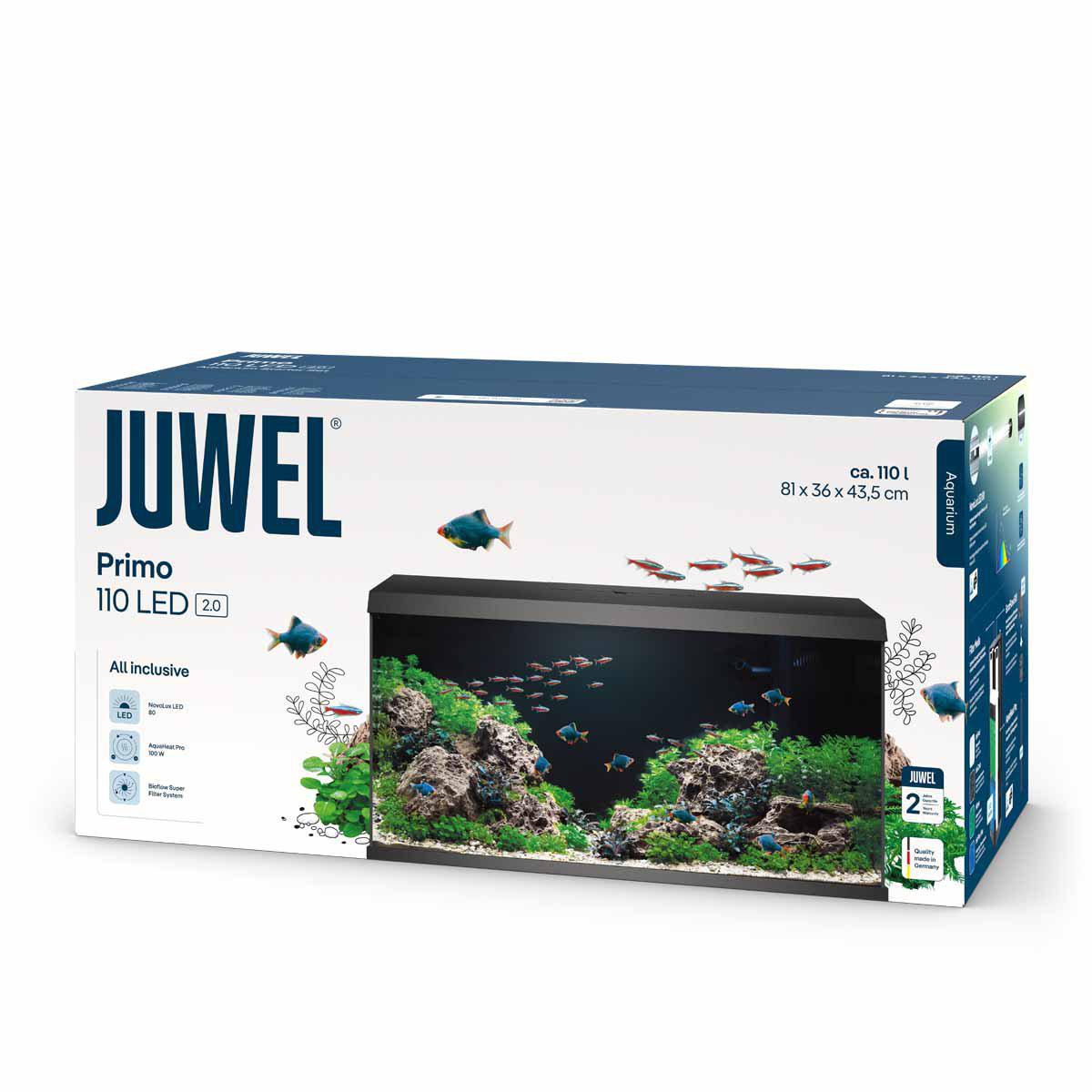 Indvendigt er Primo 110 LED forsynet med Bioflow One innerfilter, der arbejder efter princippet om sikker og effektiv filtrering — "Vandet skal blive i akvariet". Filteret indeholder højtydende filtermateriale og en Eccoflow 500 cirkulationspumpe på kun 5,5 watt, hvilket sikrer god vandcirkulation uden stort energiforbrug. Den justerbare JUWEL AquaHeat 100 watt varmelegeme er integreret i filterhuset og er ligeledes TÜV/GS-certificeret, så temperaturen holdes stabil uden synlige elementer i akvariet.