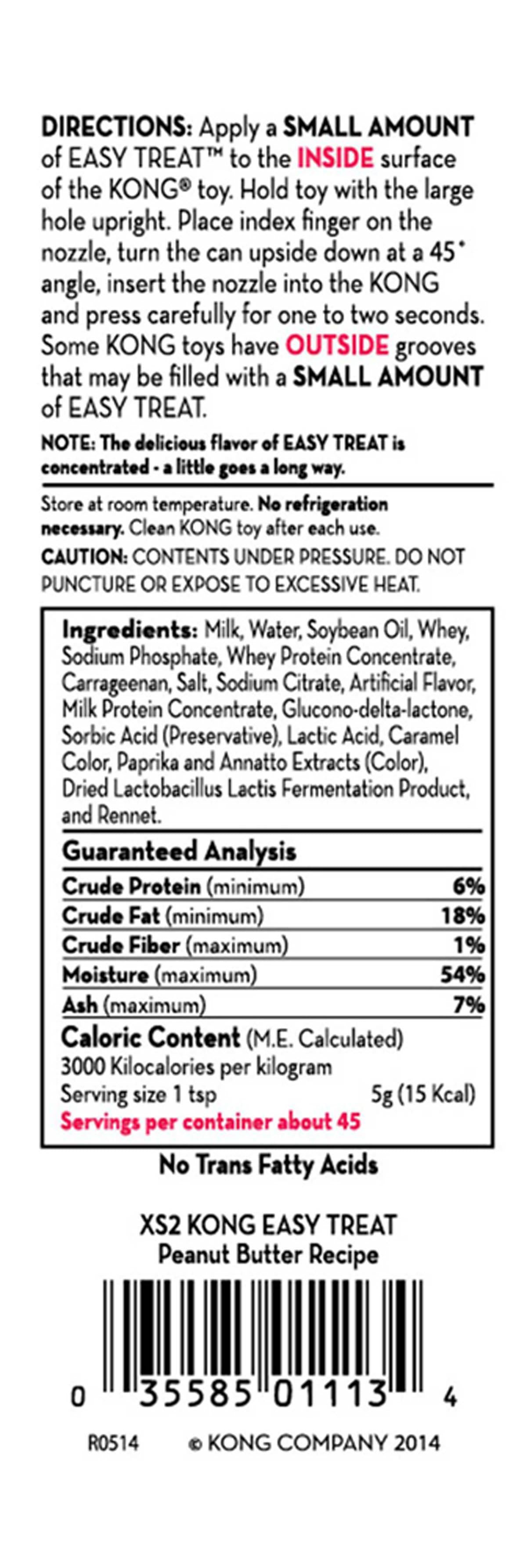 KONG Easy Treat Peanut Butter 236 ml/226 g er en lækker, letfordøjelig godbid til hunde, fremstillet i USA og fri for transfedtsyrer. Den cremede jordnøddesmag gør den ideel som fyld i KONG-legetøj og et populært valg både til hvalpe og voksne hunde.