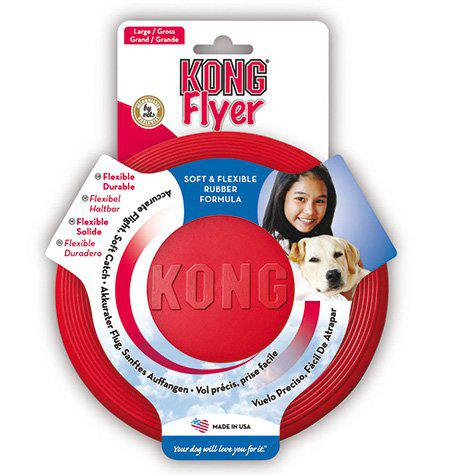 Kong Flyer L 23 x 3 cm er designet til apportering og aktiv leg. Den er lavet i holdbart KONG Classic-gummi, som giver en blødere og mere tilgivende landing ved fangst og samtidig gør skiven robust nok til gentagne kast og gribelege i parken. Frisbeen passer godt til hunde, der elsker at hente og være aktive udendørs.