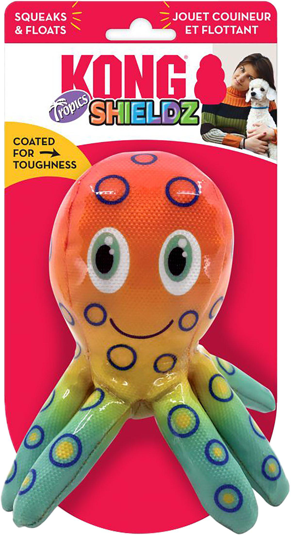 KONG Shieldz Tropics har en ultraholdbar belægning, designet til at holde længe. Den bløde blæksprutteform beskytter det tæt pakkede indre, så hunden får flere lag af engagement og stimuleres i sine naturlige tyggeinstinkter. Legetøjet er et robust plysprodukt, der kombinerer en slidstærk ydre overflade med en indbydende, blød kerne.