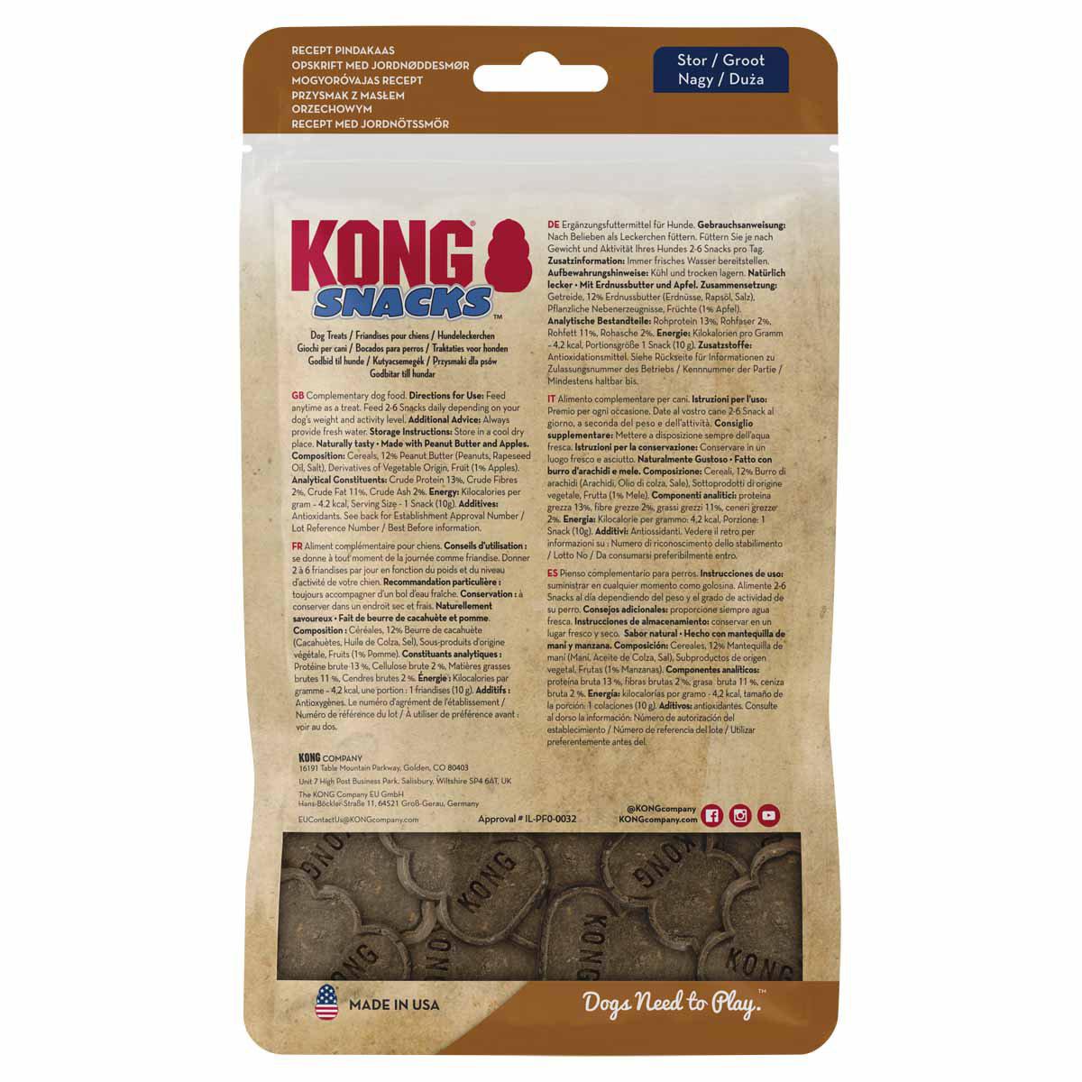 KONG Snack Peanut Butter L er en velsmagende hundegodbid med naturlig peanut butter-smag, fremstillet i USA. Disse snacks af høj kvalitet indeholder ikke hvede, majs eller soja og er udviklet som en letfordøjelig og smagfuld belønning til træning og hverdagsforkælelse.