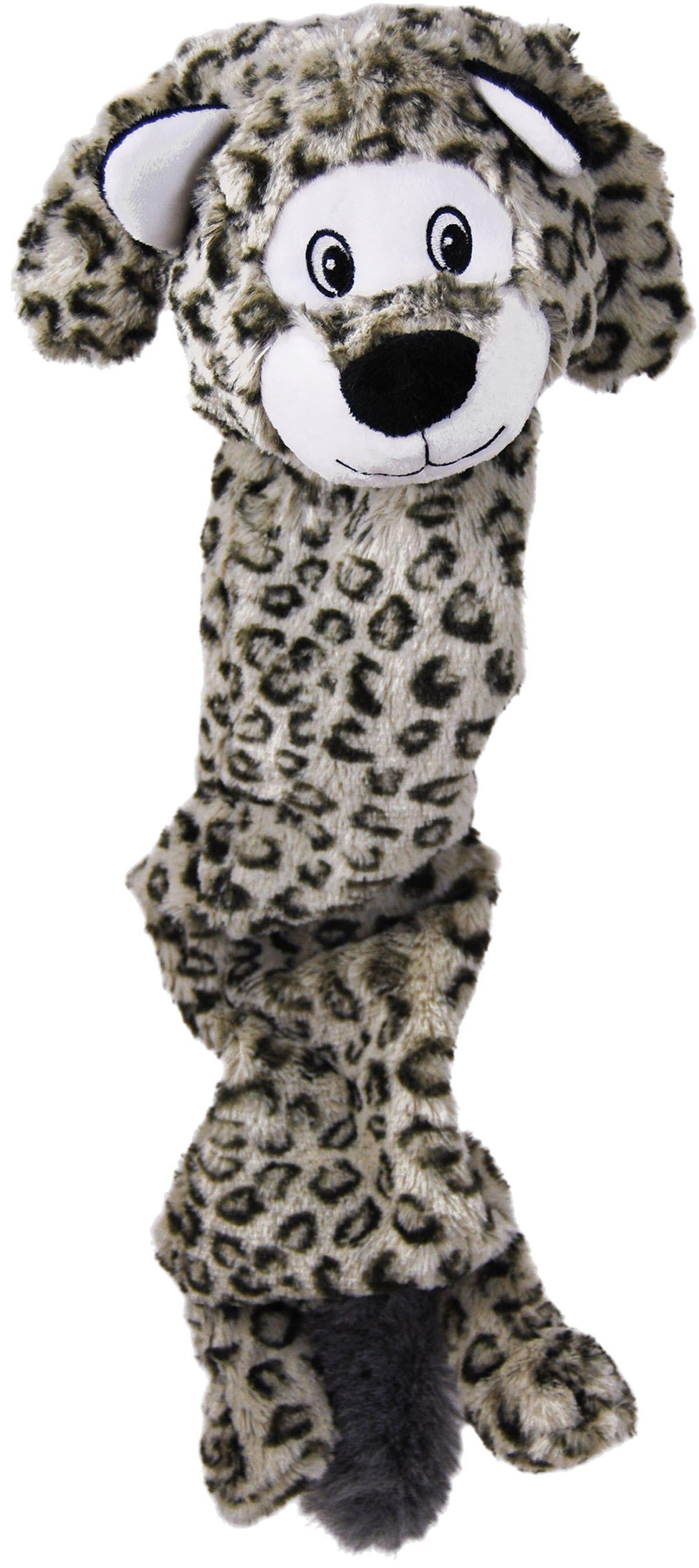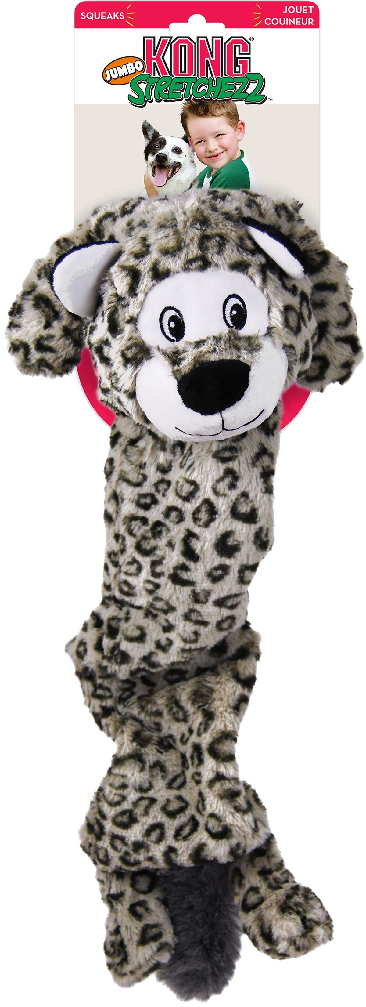 KONG Jumbo Stretchezz Snow Leopard, mål 10x30x58 cm, er et ekstra stort medlem af Stretchezz-familien designet til leg, træk og apport. Den lange, strækbare krop giver hunden ekstra rækkevidde og bevægelse — leverandørens beskrivelse nævner over 2 1/2 fod ekstra at elske — og er velegnet til hunde, der elsker at rulle, kaste og trække.