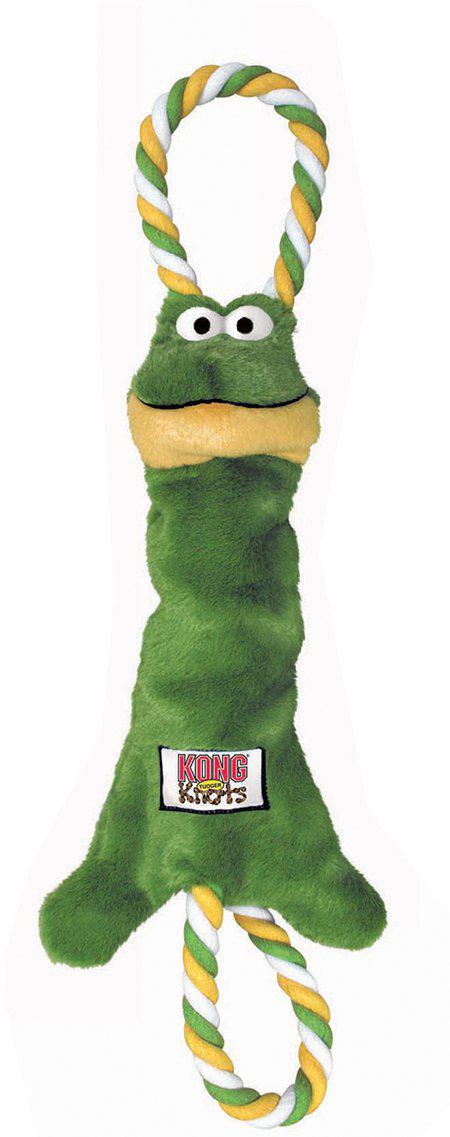 Kong Tugger Knots Frø S/M 39 cm er et robust og interaktivt træk- og rystelegetøj, som hunde elsker. Legetøjet kombinerer blødt plys og indvendige knuder af reb, så legen føles realistisk og giver god modstand ved træk.