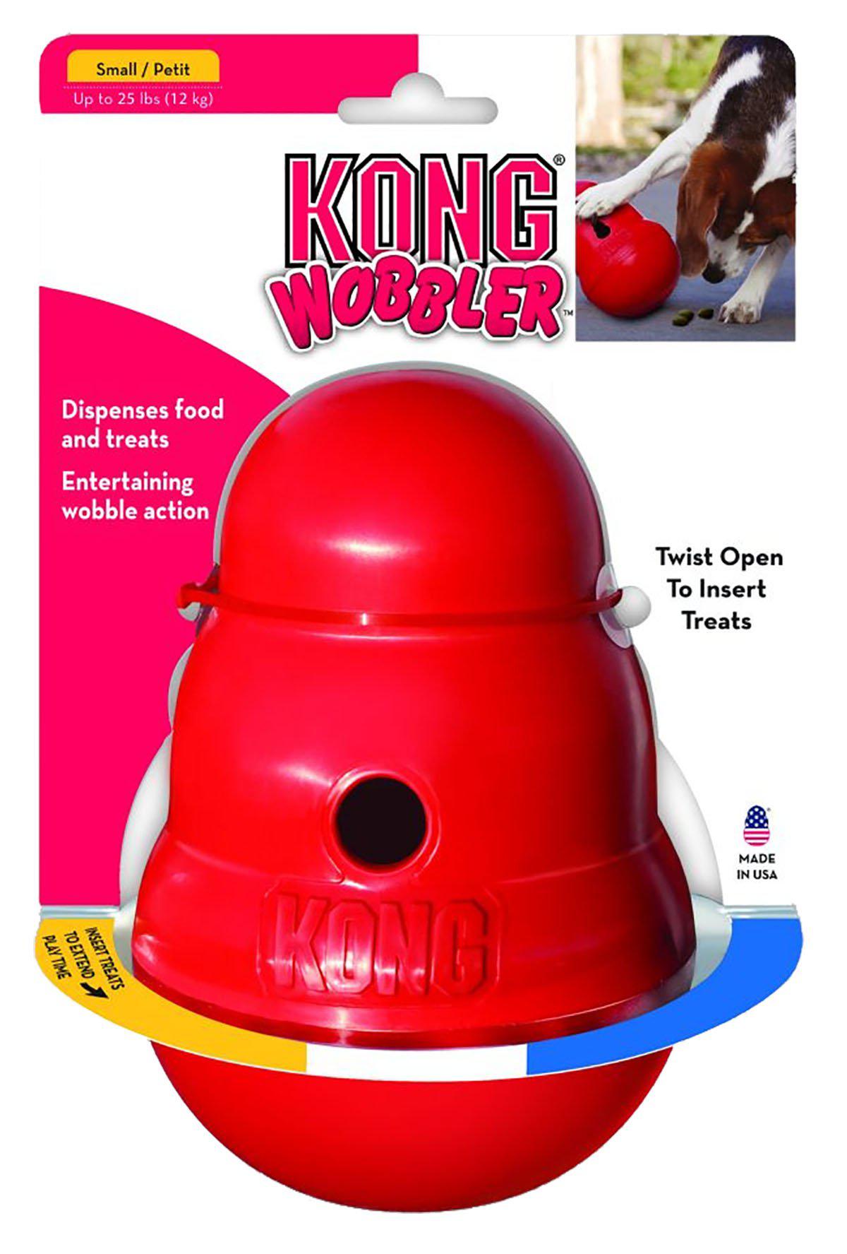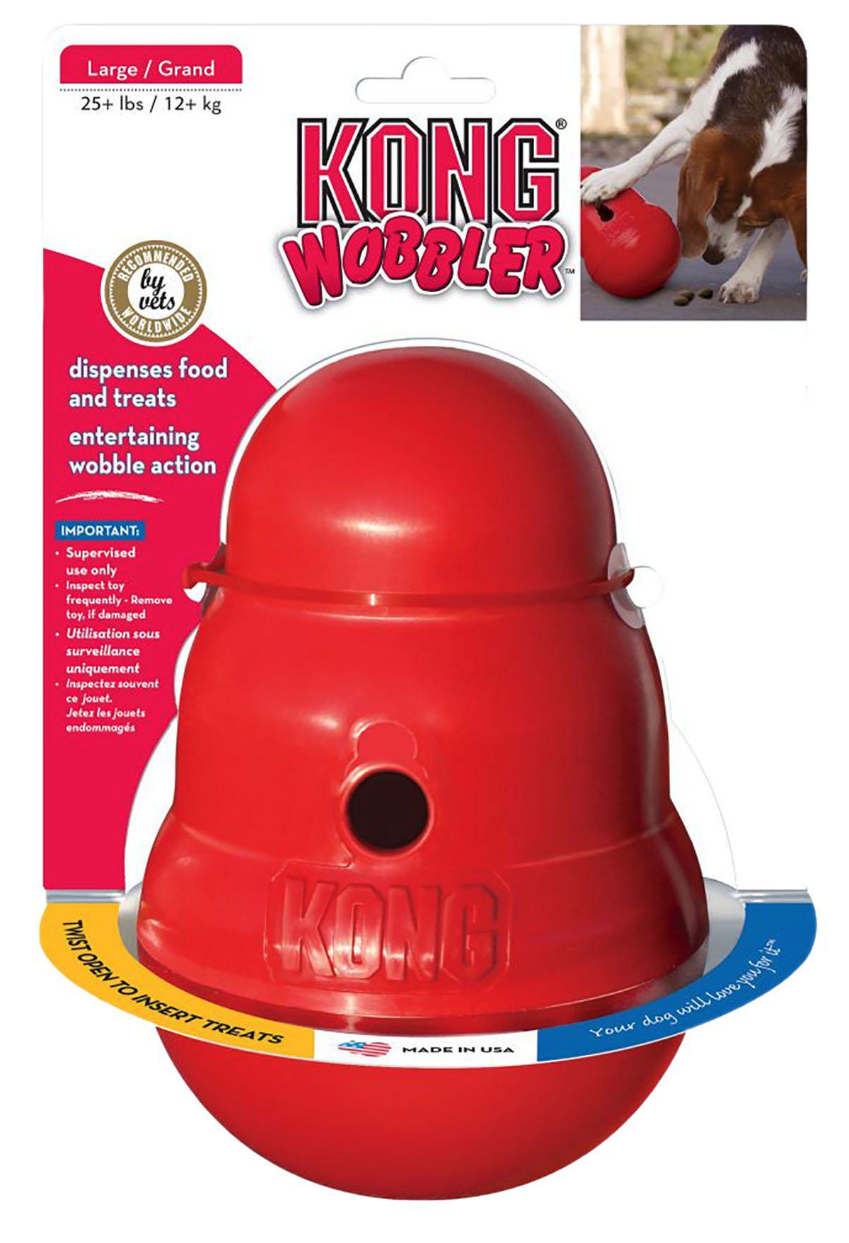 KONG Wobbler™ (Kong Wobbler L 19x13x13 cm) er en robust, mentalt stimulerende maddispenser, der forbliver oprejst, indtil hunden skubber den med pote eller snude. Når den gynger, snurrer og ruller, frigives tørfoder eller godbidder i uforudsigelige intervaller, hvilket aktiverer hundens naturlige jagt- og problemløsningstrang og holder både nysgerrige og erfarne hunde beskæftigede.