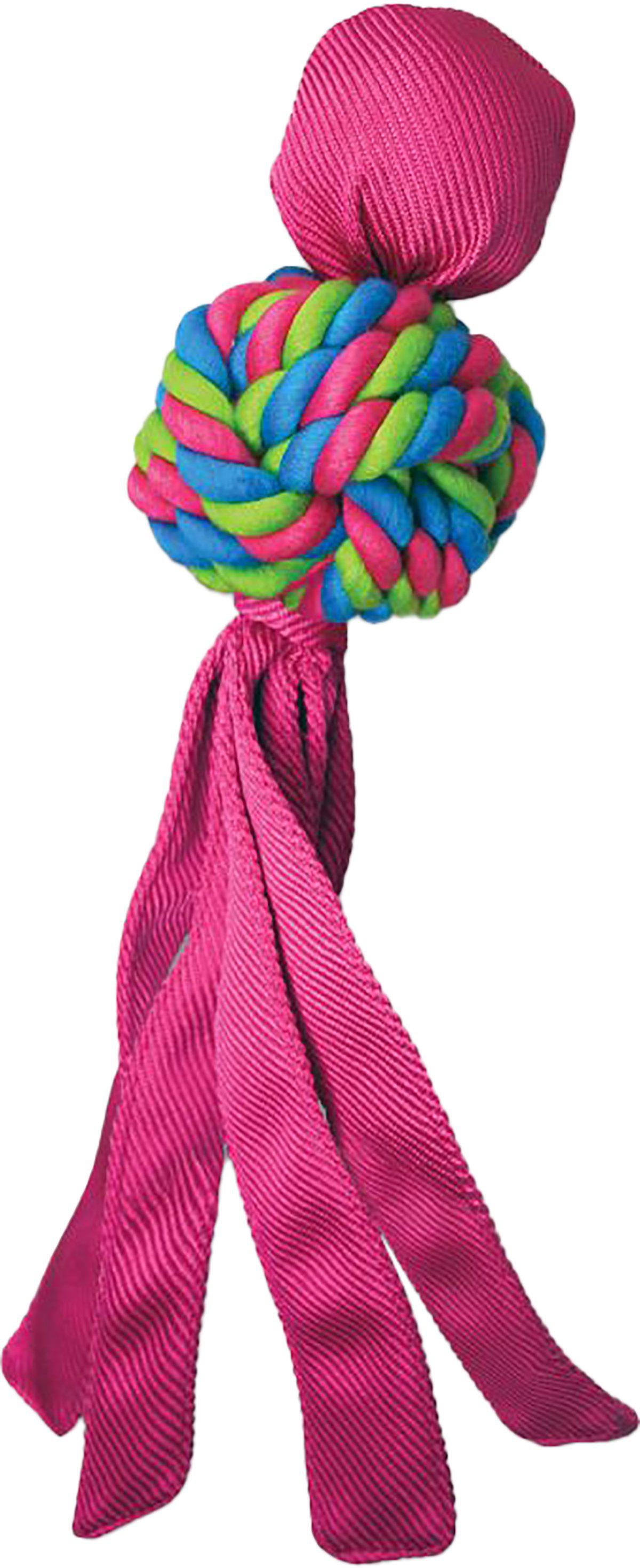 Kong Wubba Weaves Smix hundelegetøj 21x6,5x6 cm er en ny vinkel på en klassiker fra KONG. Legetøjet har en twist-knude og en bomuldsbold af reb, der hjælper med at rense tænderne, mens hunden leger. Wubbas signatur-nylonhaler gør det nemt at kaste og gribe, og den ekstra pibe på toppen får mange hunde til at vende tilbage igen og igen.