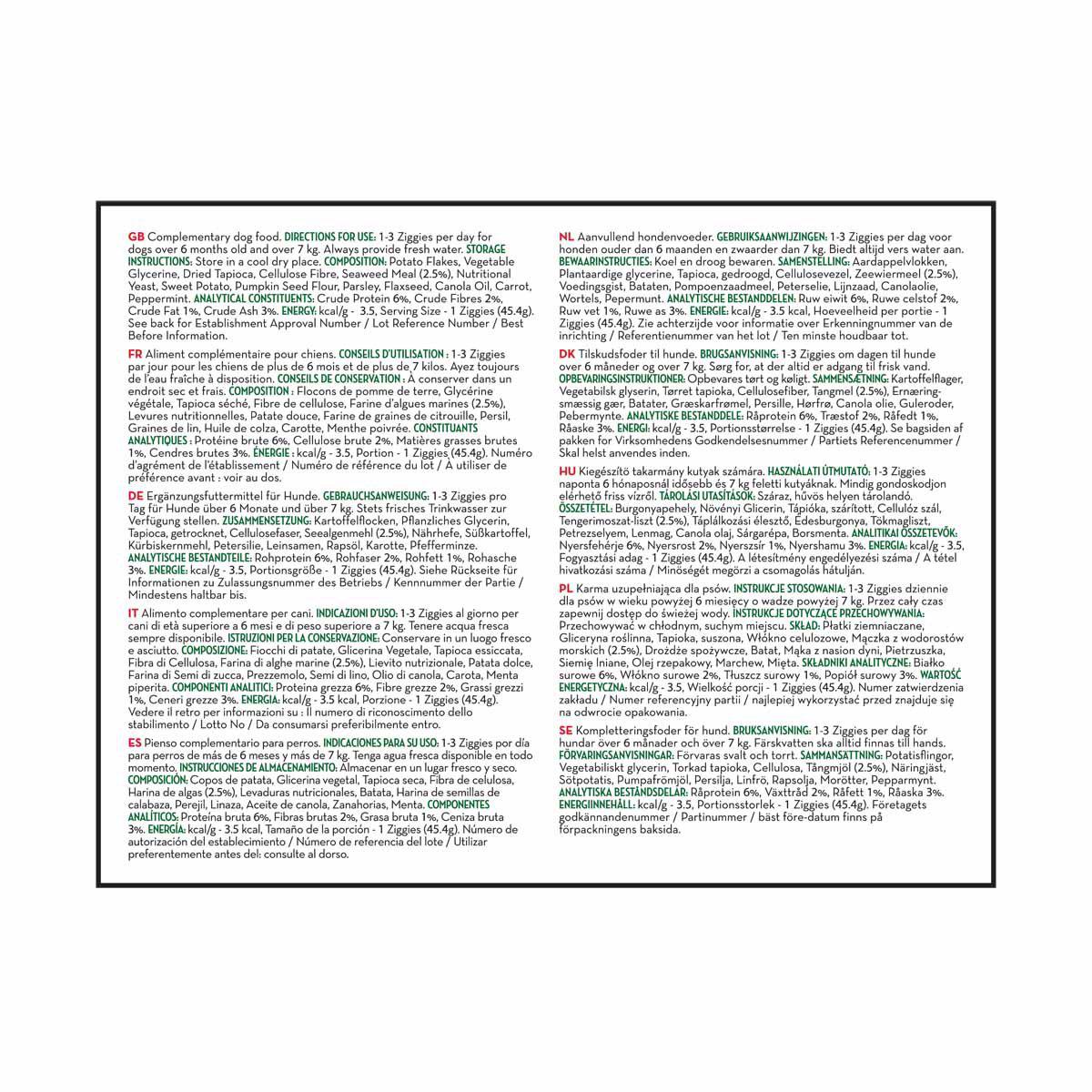 Ziggies™ er beriget med søgræs, en næringsrig kilde til mineraler, vitaminer og sporstoffer, der kan supplere din hunds kost. Den plantebaserede opskrift indeholder hverken hvede, majs eller soja og er et enkelt, naturligt alternativ til traditionelle kornbaserede snacks.