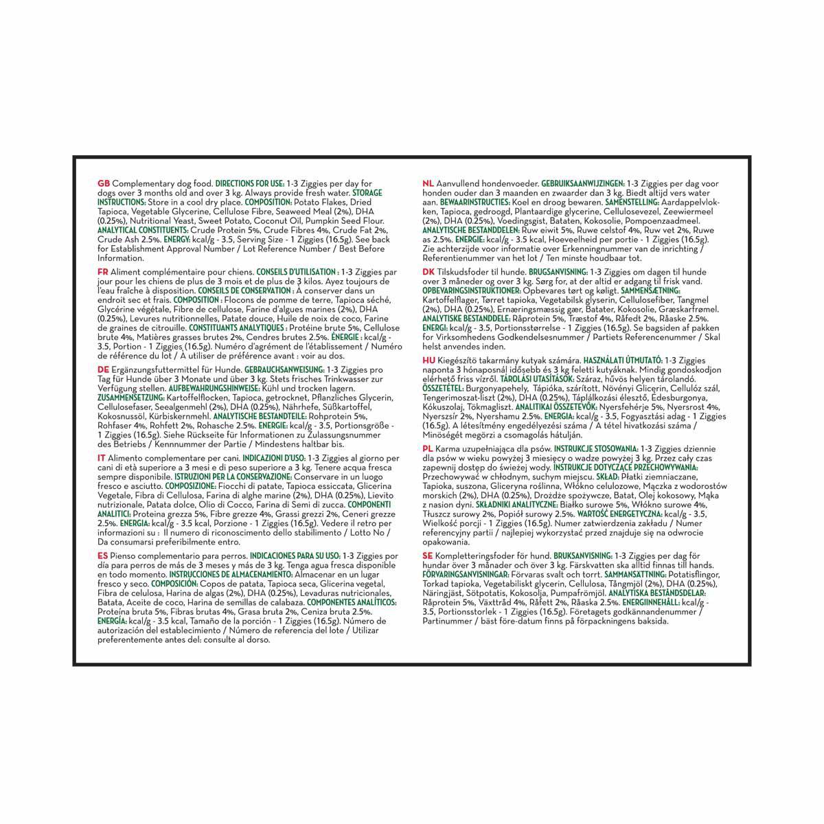 Formlen er plantebaseret og skånsom mod maven, og den er beriget med DHA udvundet fra kelp for at støtte hvalpens hjerne- og synsudvikling. Der er ingen hvede, majs eller soja i ingredienserne, hvilket gør godbidden velegnet for hundeejere, der ønsker et alternativ til kornbaserede godbidder.