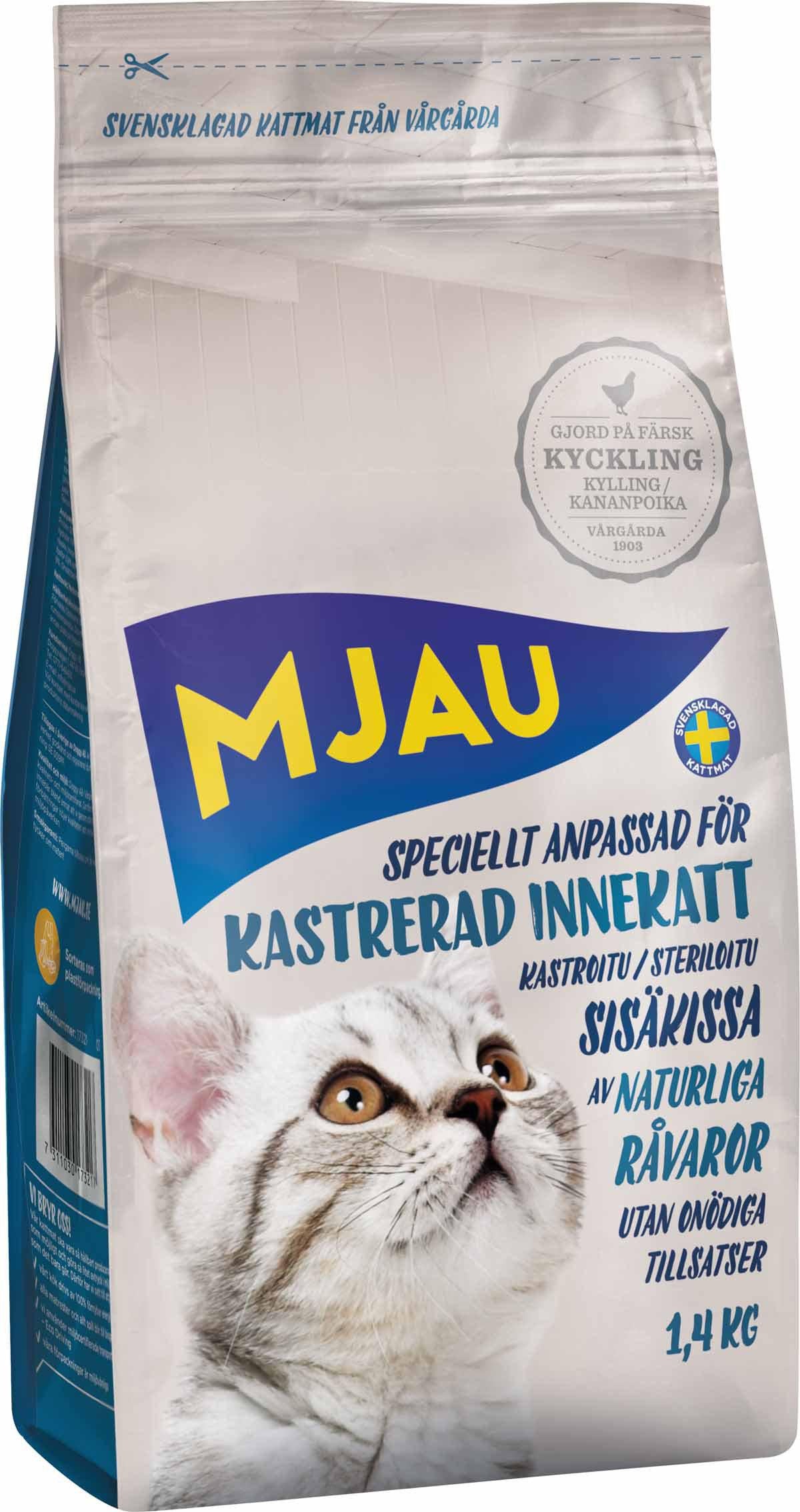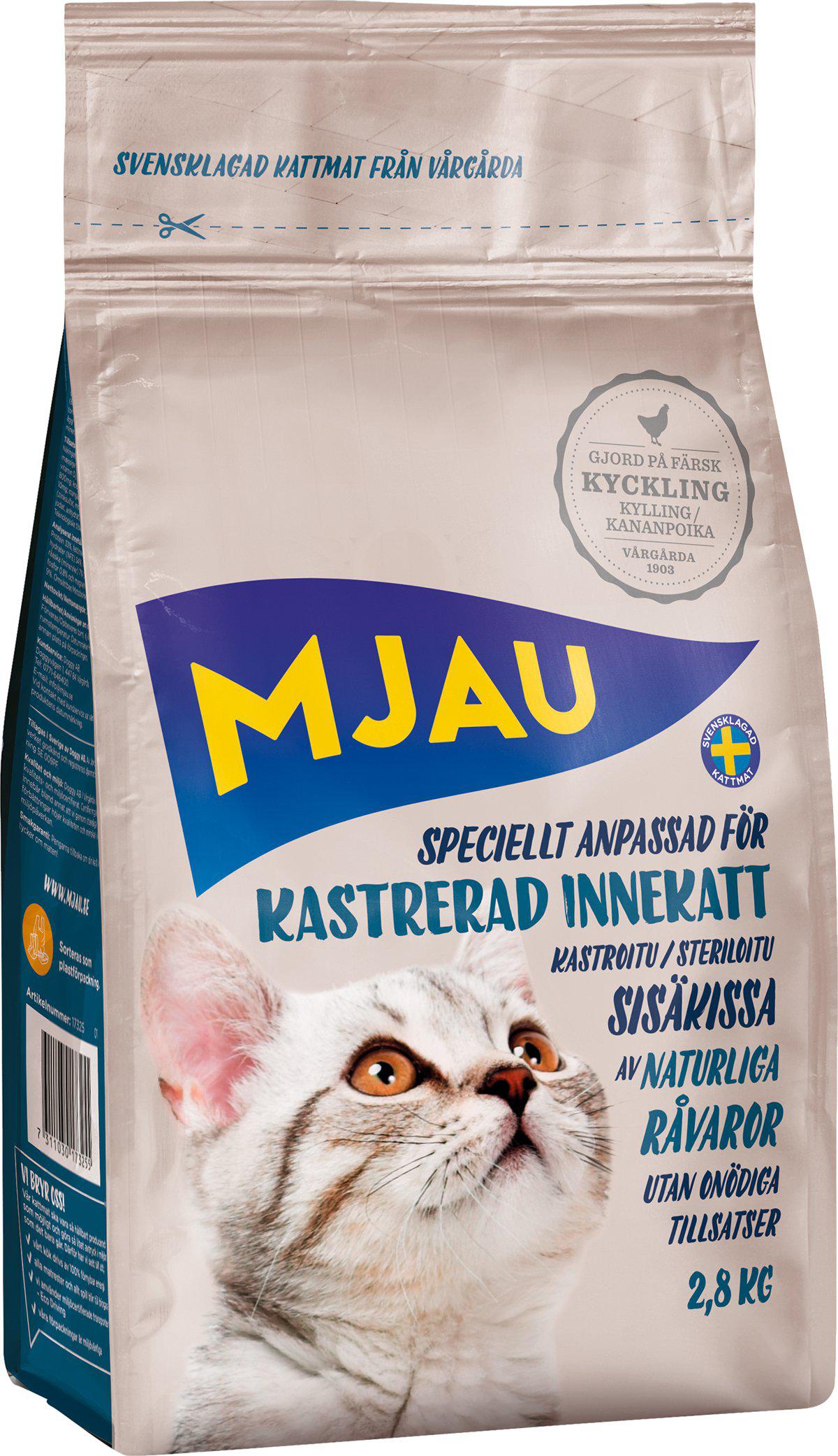 Alt kattefoder fra Mjau tilberedes i Vårgårda i det vestgötske landbrugslandskab. Hvis du ønsker et praktisk og komplet foder til din indekat efter kastration, er dette et velegnet valg — køb online eller i butik, og skift gradvist foderet for at sikre en god overgang for katten.
