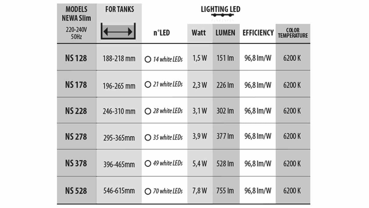 LED'erne er overtrukket med en speciel ekstraklar polyurethanresin, der giver en usædvanligt transparent overflade, som ikke gulner med tiden. Med den nyeste generation af lysdioder opnår hver stang i NEWA SLIM-serien højt lysudbytte ved lavt energiforbrug og en lyseffektivitet på over 100 lm/W (hvidt lys). Den gennemsnitlige levetid er angivet til mere end 54.000 driftstimer (cirka 15 år ved 10 timers daglig brug), hvilket gør Newa Led Slim Daylight 528 til et energieffektivt og holdbart valg til akvariebelysning.