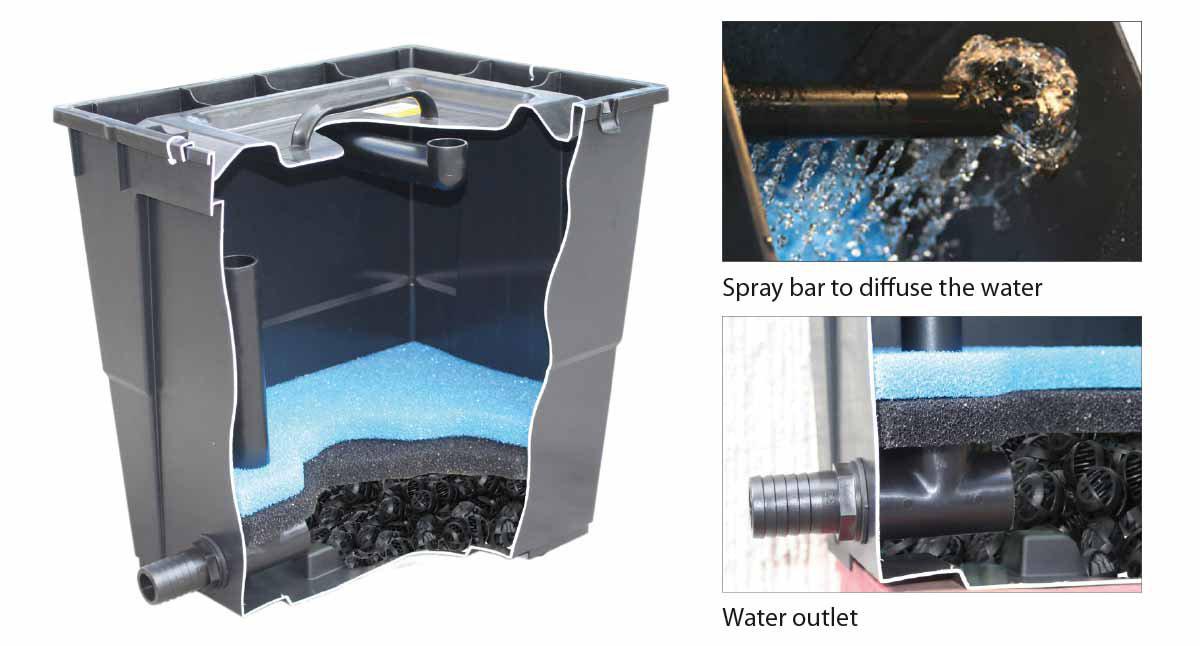 Systemet leveres med filtreringsskum, kolfilter og NEWA Aqua Bioglobe polypropylenkugler for optimal biologisk filtrering. En spraybar optimerer vandsfordelingen gennem hele filtermediet og fremmer spredningen af gavnlige bakteriekolonier, mens den eksterne beholder er stød- og UV-stråleresistent for lang holdbarhed.