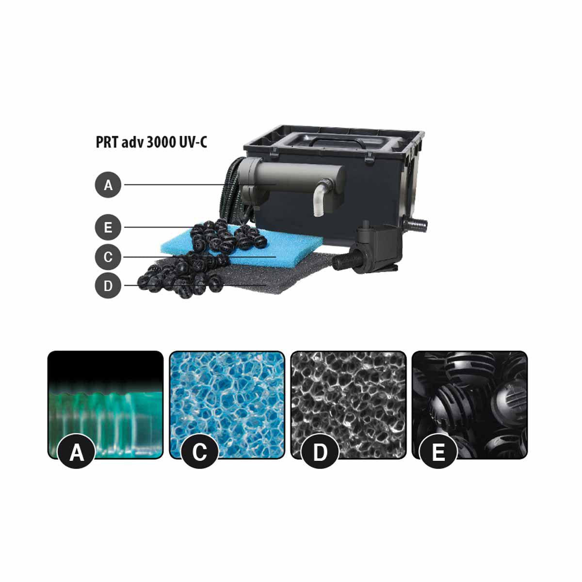 Med 5 m spiralrør, slangekoblinger og nødvendigt tilbehør er Pratico adv. 3000 klar til montering, og kombinationen af UV-C samt mekanisk og biologisk filtrering fjerner grønne alger og reducerer bakteriebelastning uden brug af kemikalier — for et klarere, mere naturligt dammiljø.