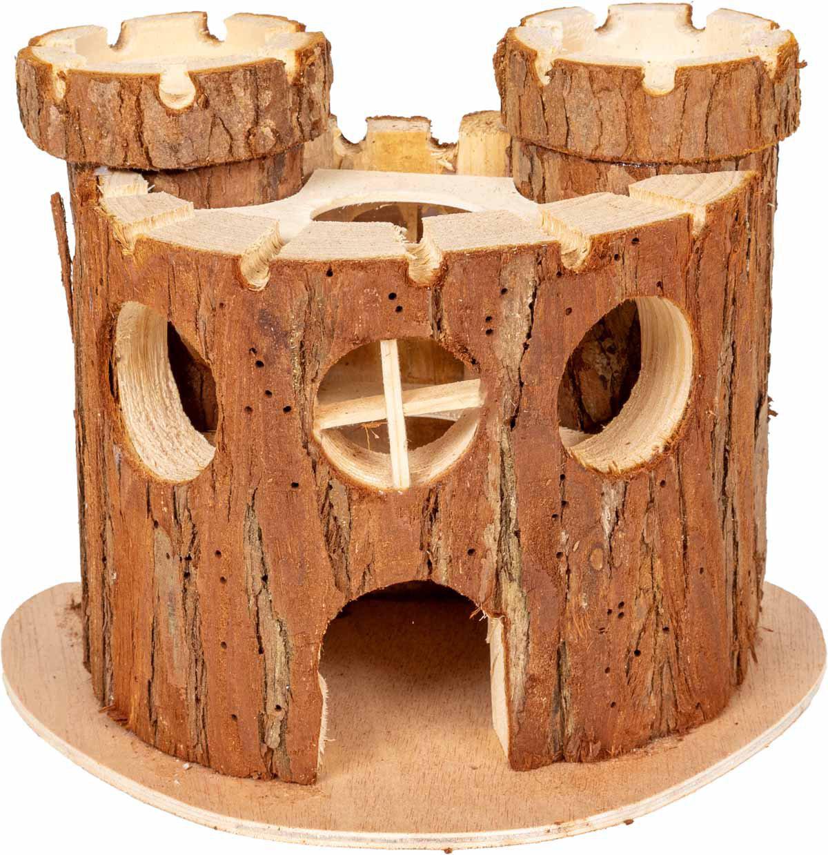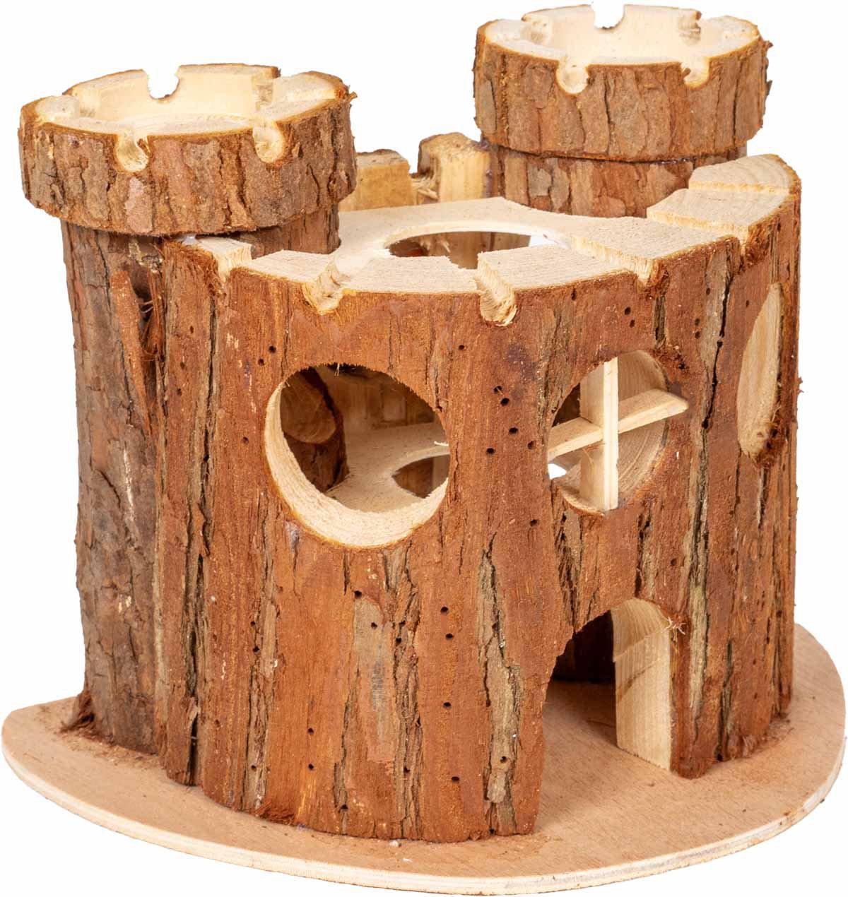 Den runde bundplade sikrer god stabilitet i buret, og slottets åbne design fremmer naturlig udforskning og aktivitet. Materialet er naturtræ med bark, hvilket giver et rustikt, indbydende udseende, der passer flot ind i burindretningen.