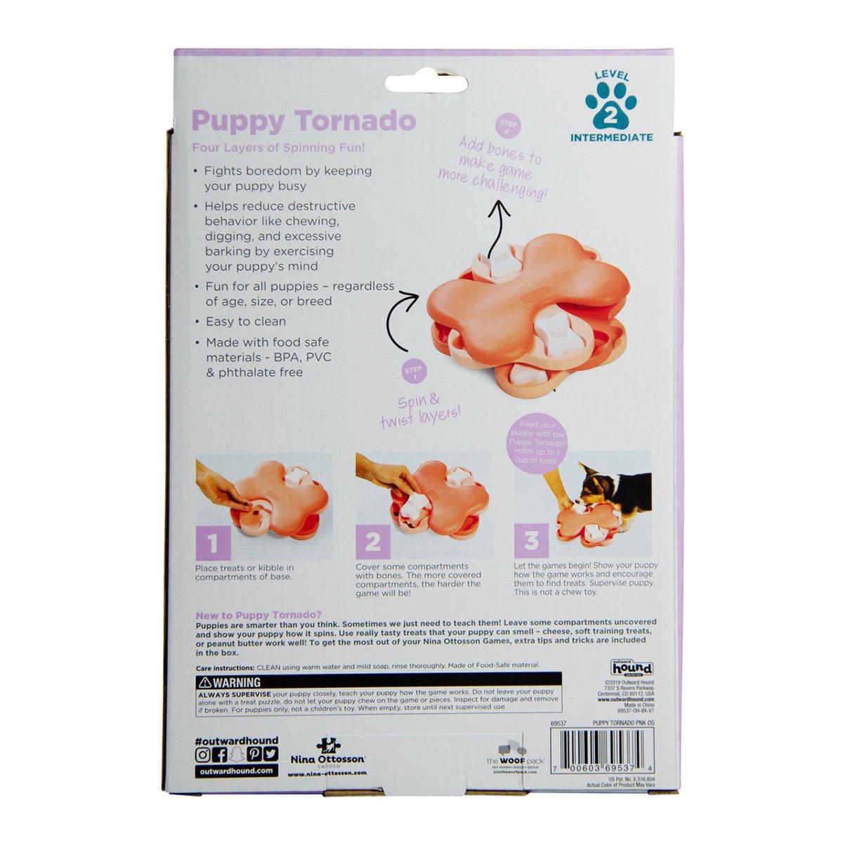 Puppy Tornado lyserød er en variant af Nina Ottosson Dog Tornado, et interaktivt feeder- og aktiveringslegetøj, designet til at udfordre din hunds hjerne. Med fire drejelige lag og i alt 12 rum kan du gemme godbidder eller en hel måltidsportion, og din hund skal løse flere trin for at få fat i belønningen. Det gør Dog Tornado til et effektivt godbidsspil og et praktisk træningsredskab til daglig mental stimulering og hverdagslydighed.
