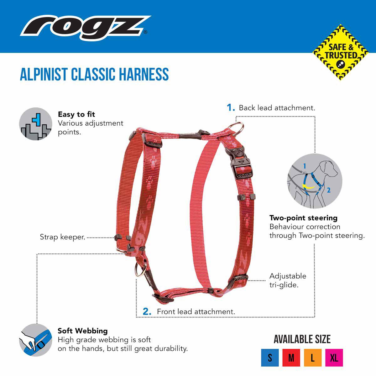 Modellen er fuldt justerbar og fremstillet i slidstærke materialer, så den kan tilpasses efter hundens form og bevægelser. Rogz Alpinist er desuden designet til at kunne bruges sammen med Rogz-fæste til bilbælter, hvilket gør den praktisk både på ture og ved transport.