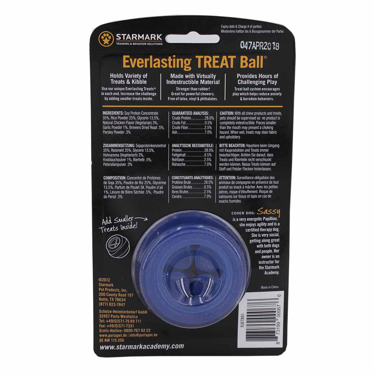 Giv din hund en sikker og sjov tyggeudfordring med STARMARK TreatBall. Everlasting Treat Ball kombinerer leg og belønning for at mindske destruktiv kedsomhed. Den er lavet i et blødt, men holdbart patenteret materiale, der tåler aktive tyggevaner.