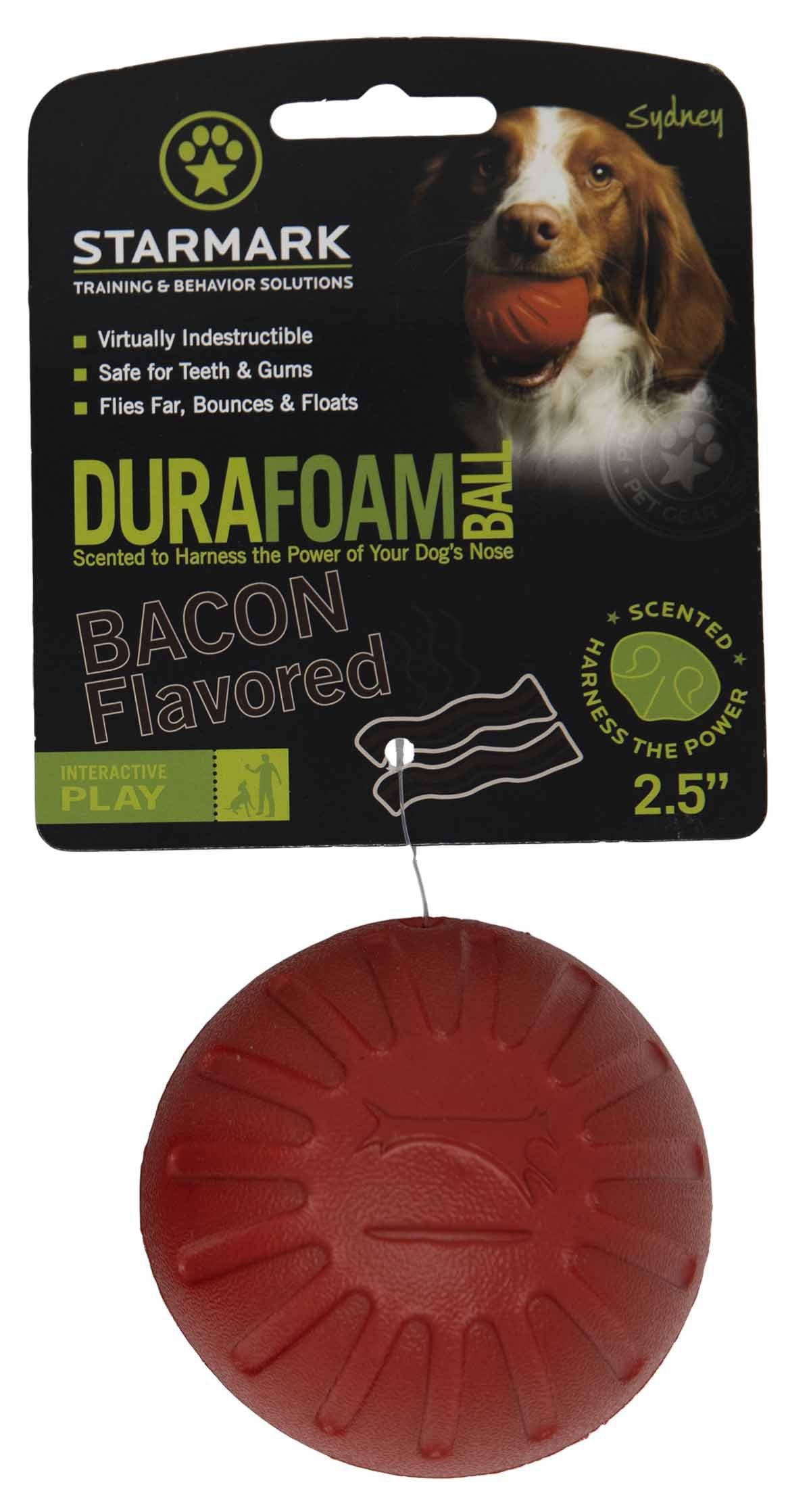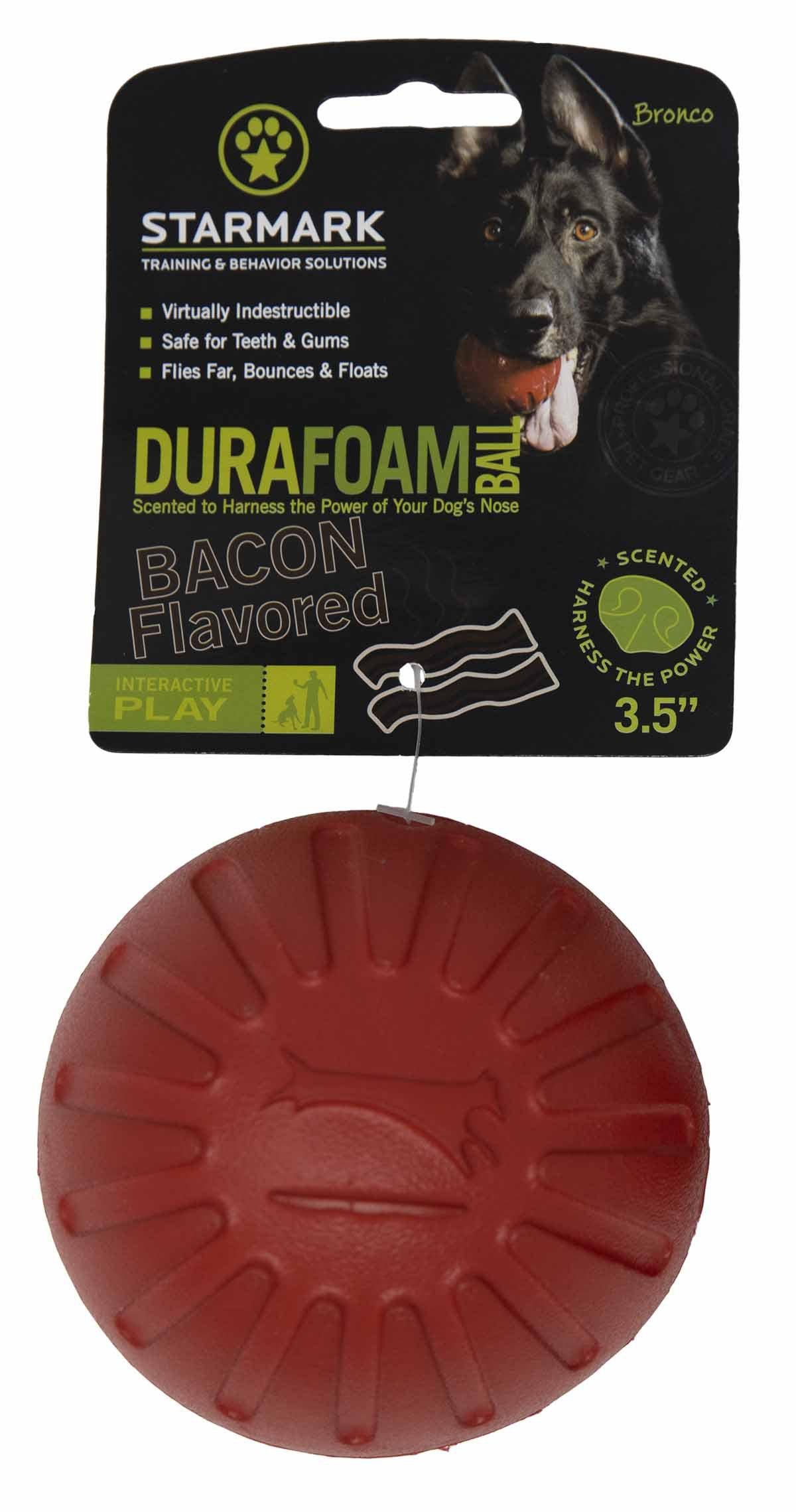 Starmark skumbold bacon 9 cm er fremstillet i det patenterede Durafoam-skummateriale, som giver en blød og sikker bold i hundens mund samtidig med en god studs. Bolden flyder i vand, hvilket gør den velegnet til apportleg både på land og i vand ved sø og strand. Den indbyggede bacon-duft gør det lettere for hunden at finde bolden og stimulerer naturlig jagt- og fødesøgsadfærd.