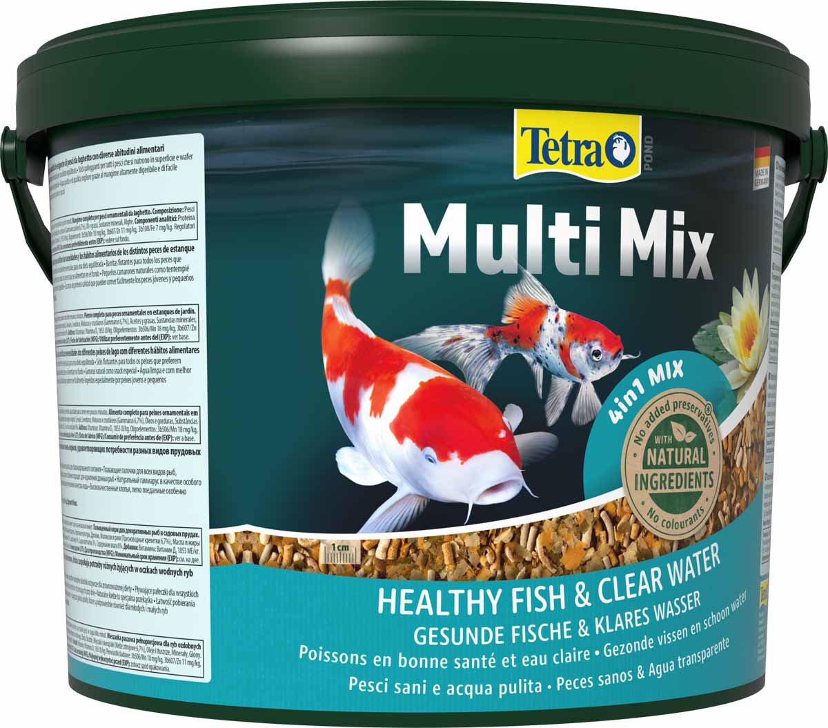 Tetra Pond Multimix 10 L er en alsidig, komplet blanding, der samler fire forskellige fodertyper i én beholder for at dække hele dammens behov. Blandingen indeholder flydende pinde til overfladeædere, sjunkende flagefoder til bundlevende fisk, lette højkvalitetsflager til små og unge fisk samt naturlig gammarus som et velsmagende mellemmåltid.