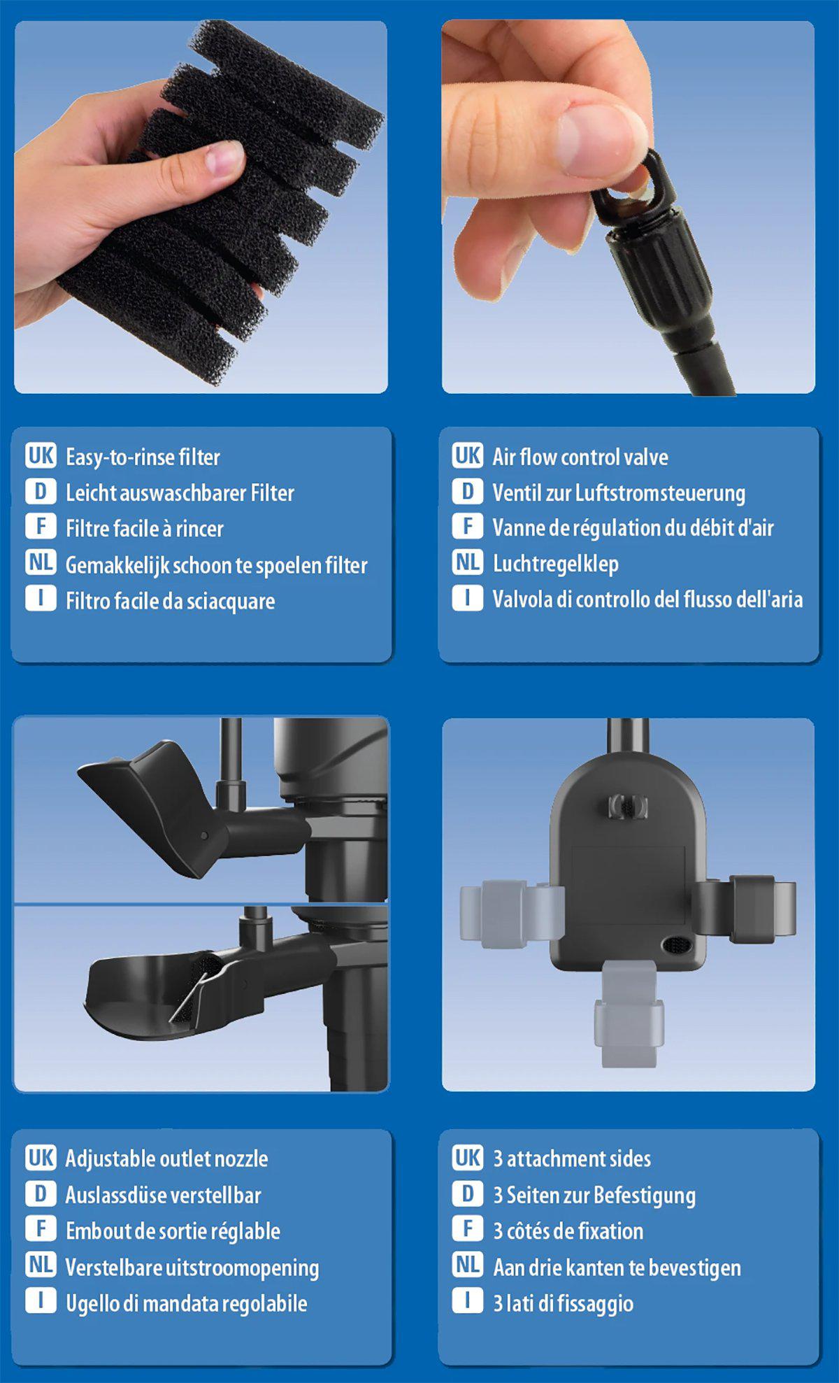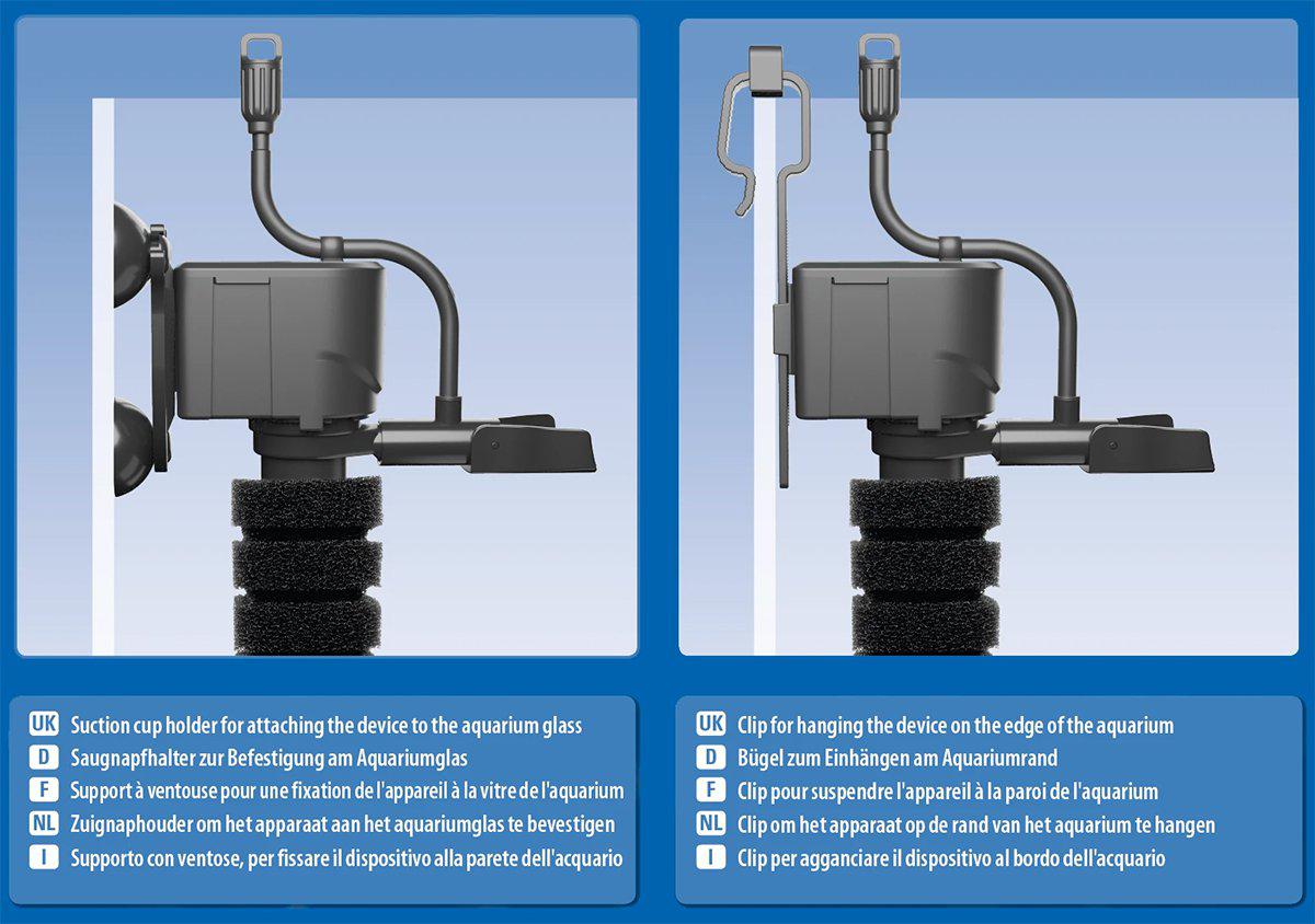 Filteret er designet til hurtig installation og er klar til brug på få sekunder uden komplicerede opsætninger. Det justerbare udløbsmundstykke gør det let at styre vandstrømmen, forbedre cirkulationen i akvariet og sikre tilstrækkelig iltning af vandet.