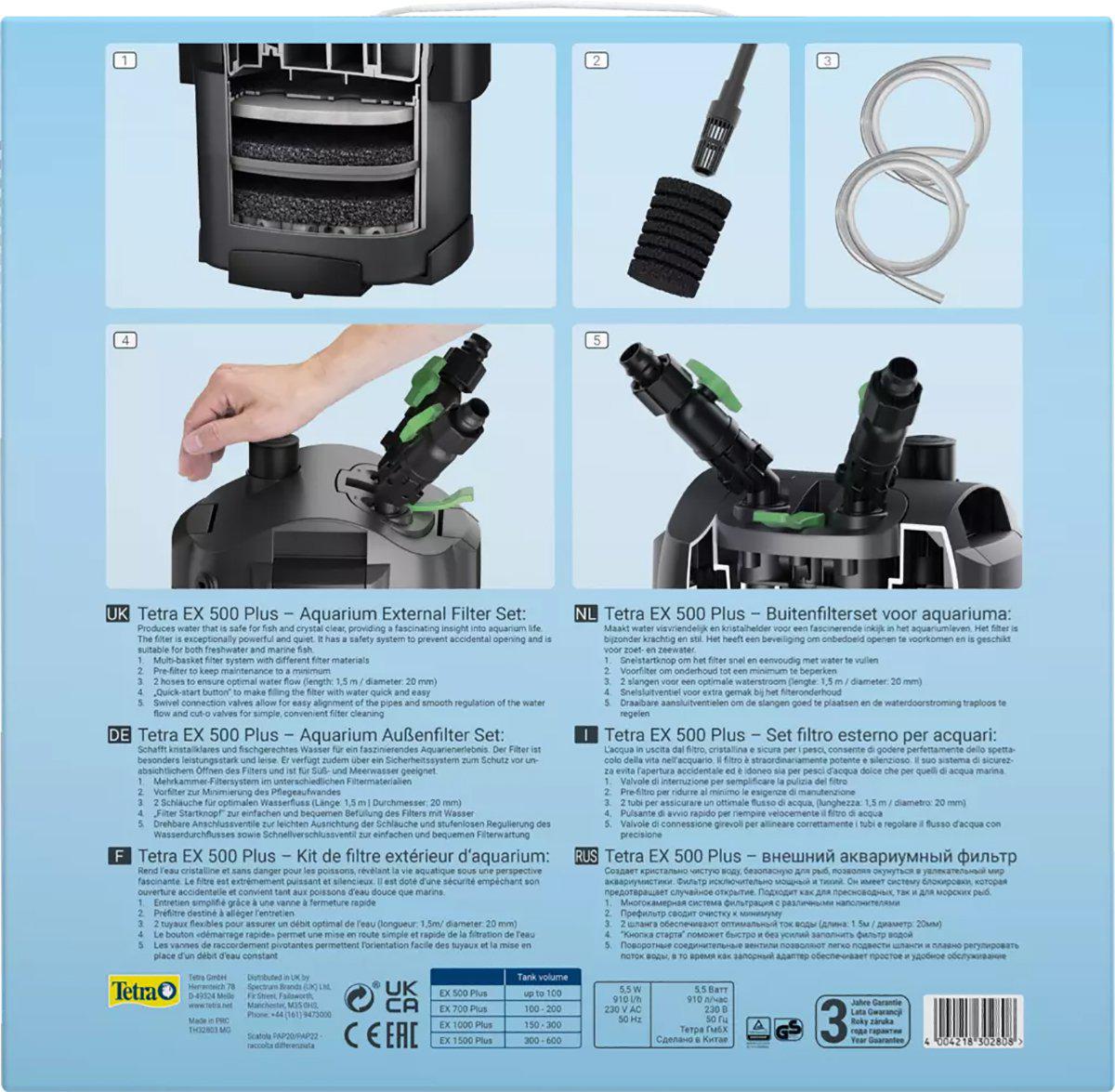 Praktiske detaljer gør vedligeholdelsen enkel: de enkelte filterpatroner har håndtag, så de let kan løftes ud ved rengøring, og udløbsrør samt slange kan tilpasses til akvariets opstilling. Reglerventiler på indløb og udløb giver præcis indstilling af vandflow, så filteret nemt kan tilpasses forskellige opsætninger. Tetratec Ex Plus er et robust eksternt akvariefilter med gennemprøvet flertrinsfiltrering og enkel service.