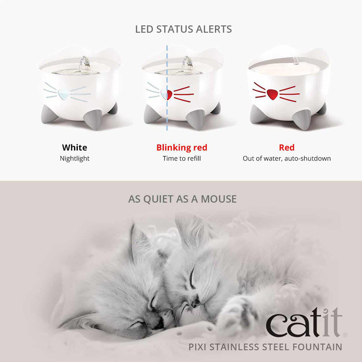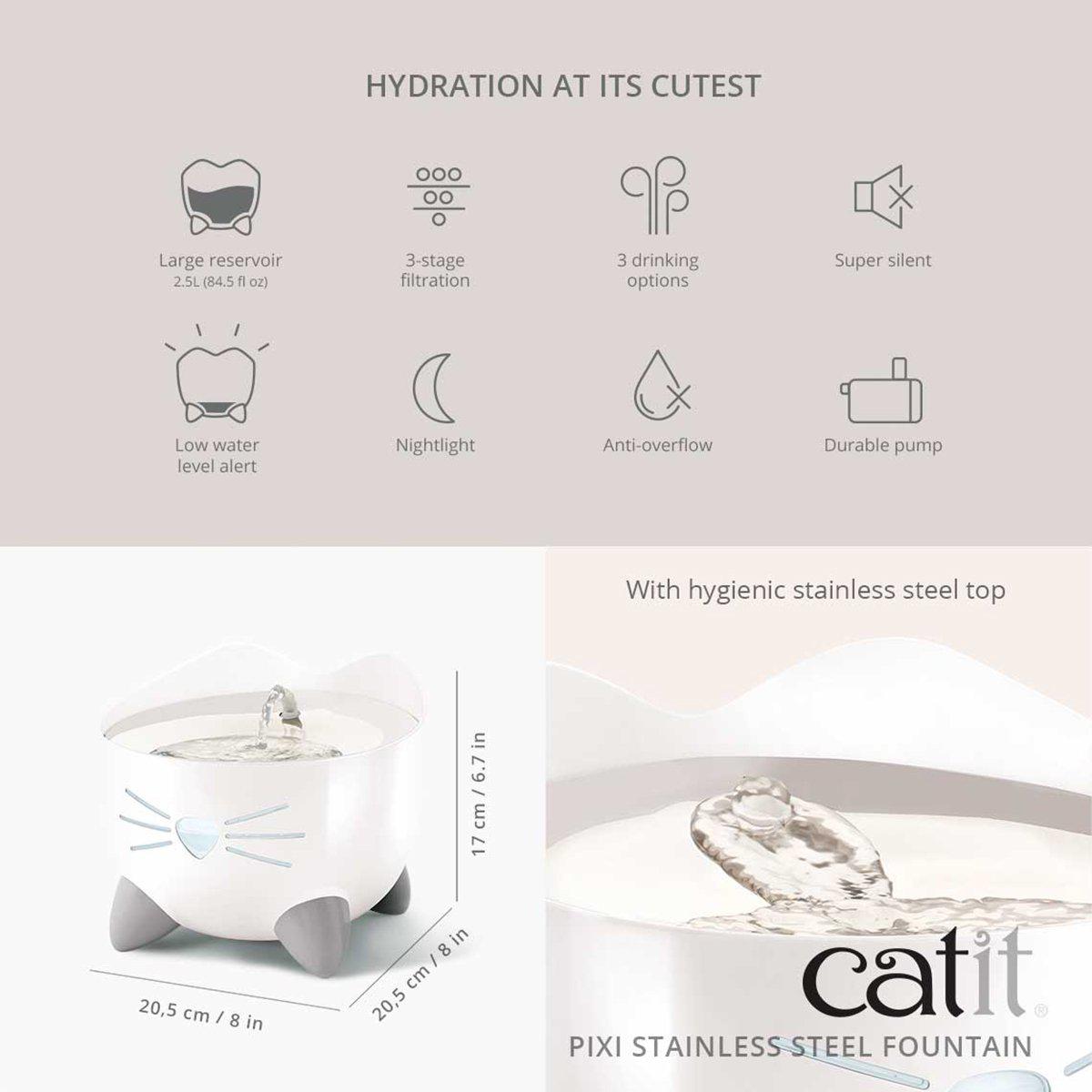 Catit PIXI tilbyder flere drikkealternativer, så din kat kan vælge mellem forskellige vandstrømme, hvilket ofte øger interessen for at drikke. Trippelfiltreringen sørger for løbende rensning af vandet, så du kan være tryg ved kvaliteten af kattens drikkevand.